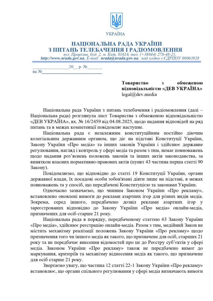 Національна рада з питань телебачення та радіомовлення заявила, що наразі відсутні будь-які кодекси чи правила, які регулюють поширення реклами азартних ігор в онлайн-медіа – пише видання DEV, посилаючись на відповідь державної інституції.