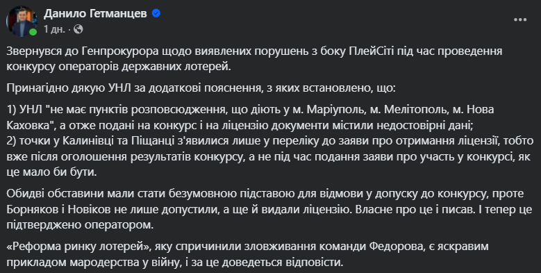 Публічна дискусія навколо ліцензування операторів лотерей перейшла у фазу офіційних звернень до правоохоронних органів. Голова профільного комітету Данило Гетманцев офіційно звернувся до Генерального прокурора, стверджуючи, що оператор власноруч підтвердив факти порушень.